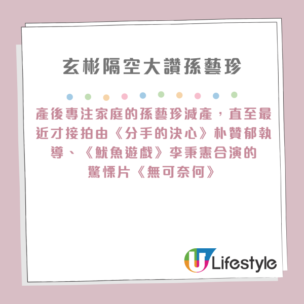 產後專注家庭的孫藝珍減產,直至最近才接拍由《分手的決心》朴贊郁執導、《魷魚遊戲》李秉憲合演的驚慄片《無可奈何》,玄彬大讚妻子「完美地擔當母親、妻子及演員的角色」,更表示看到孫藝珍為自己的付出十分感謝。