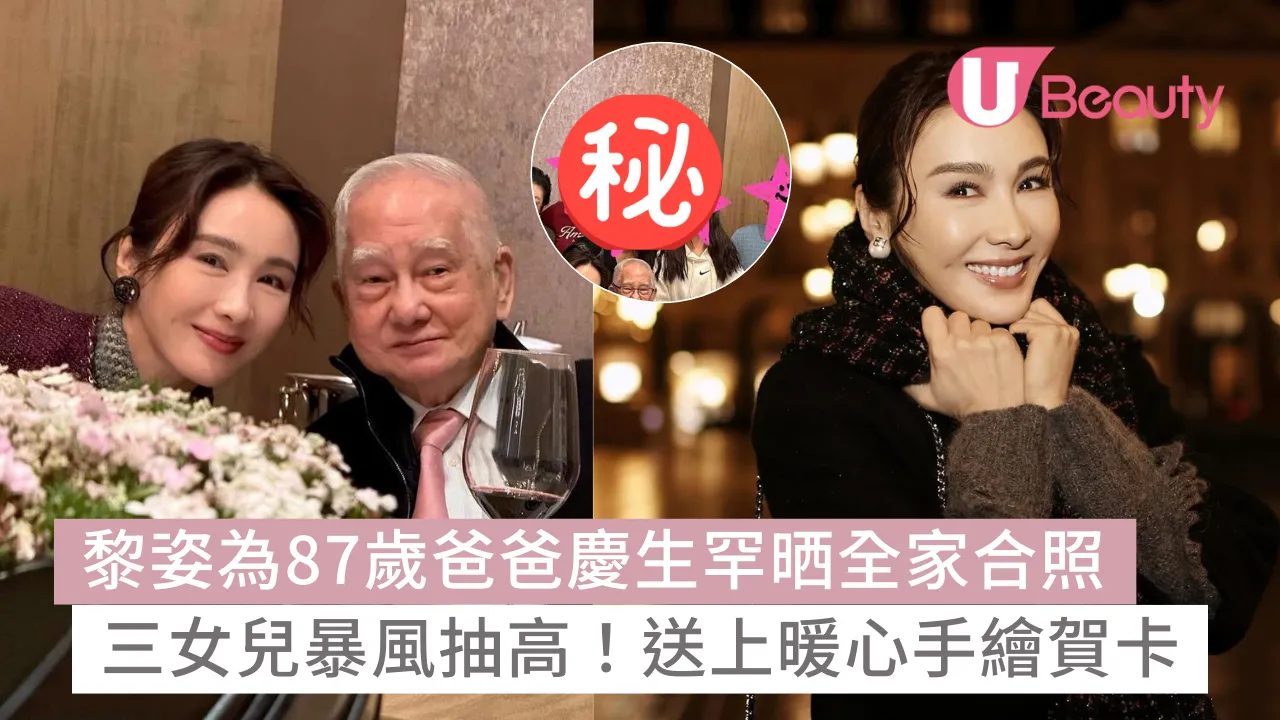 有「最美CEO」稱號的黎姿(現名馬黎珈而),對父母相當有孝心,日前適逢爸爸87歲生日,黎姿與媽咪、弟弟黎嬰以及3名寶貝女一同食飯慶祝,孫女們更送上手繪賀卡給公公,場面極溫馨。黎姿其後亦在社交平台分享喜悅,三代同堂全家合照罕有曝光。