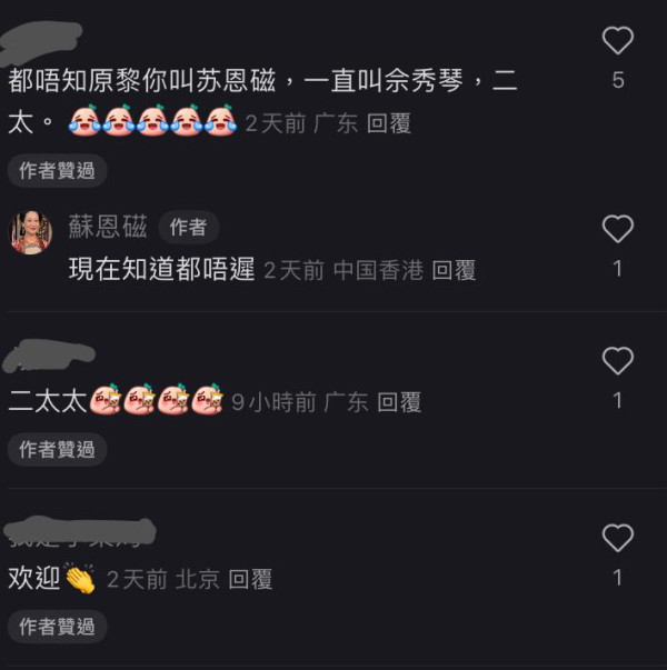 蘇恩磁的小紅書內容暫時不算豐富,有網民就建議:「我希望多多看到您在TVB拍戲的生活日常,比如拍戲、化妝、試鏡、背台詞、午餐等,哈哈好期待。」雖然蘇恩磁一直演繹「闊太」、「媽媽」的角色,原來現實生活中的她仍然小姑獨處,早年她受訪時曾坦言對愛情有抗拒,上一次拍拖已是10多年前的時,目前已經習慣一個人生活,直言現在的年紀再開始與男友相處已經難以適應。