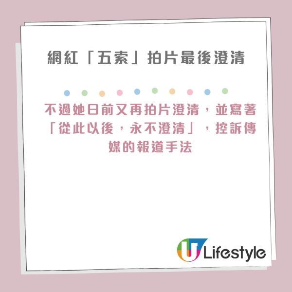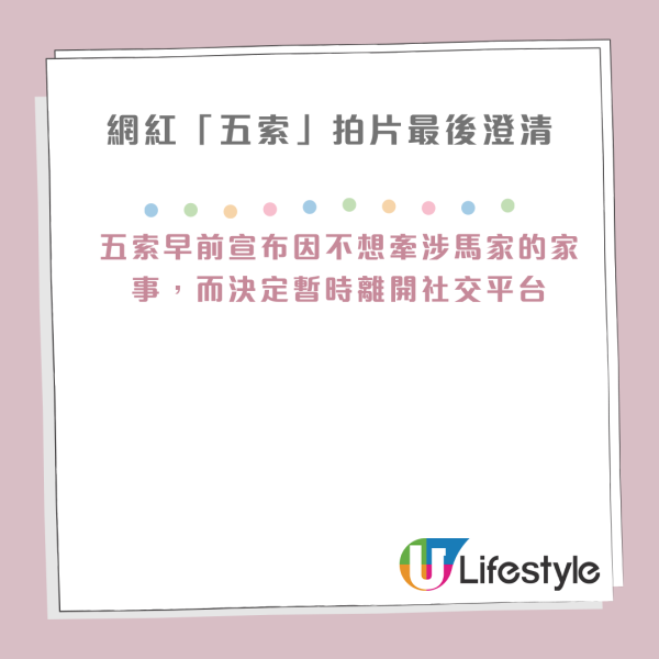 五索早前宣布因不想牽涉馬家的家事,而決定暫時離開社交平台,不過她日前又再拍片澄清,並寫著「從此以後,永不澄清」,片中五索除了控訴傳媒的行為外,更表示不會接受任何訪問,又希望大眾將焦點放在自己身上,而不是馬家。