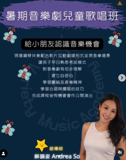 早前她亦在IG宣佈加盟了謝東閔和吳業坤的音樂學院,開設音樂劇兒童歌唱班,並會以全英文授課。她表示「之前都有試過幫小朋友補習、教小朋友唱英文歌,本身都好鍾意小朋友」並笑言「心如現實又可以做一個老師,幾得意嘅體驗。」至於許多粉絲關心的演藝方面,她直言未來會有不同的嘗試,例如進行直播工作和參與拍攝工作,她希望自己在不同範疇都能不斷進步。