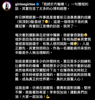 她表示運動員的生活和正常人相比下,要放棄很多休閒時光,要忍受排山倒海的訓練和比賽帶來的傷痛,同時亦需要經歷在如何在失敗中繼續堅持下去,「在獲得高光時刻之前,很多時候都是孤獨的。看到她最終能夠排除萬難,成為真正的世界第一,真的太振奮人心!」當Gin Lee看到 江旻憓在賽事中反敗為勝,最後取得金牌也讓提醒了自己。「要勇敢面對困難,堅持不懈,就能看到希望!」