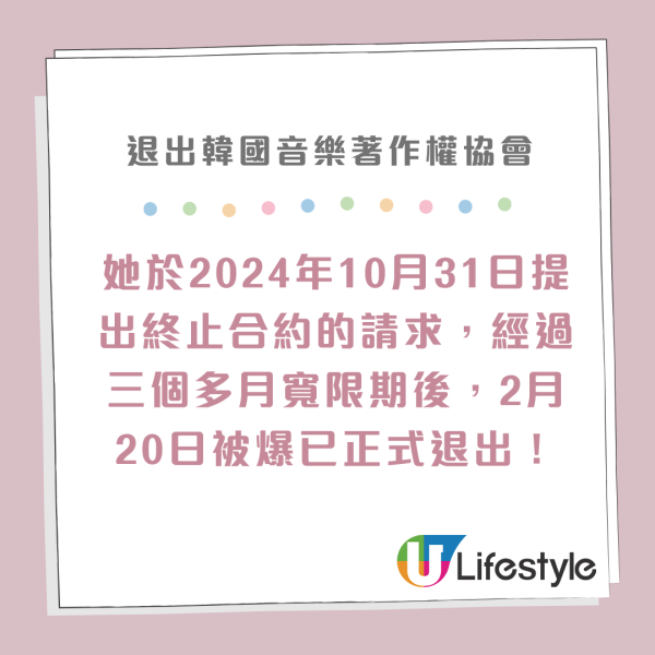 由於Rosé目前在美國地區的工作較多,她早於2024年10月31日向韓國音樂著作權協會(KOMCA),提出終止合約的請求,經過三個月的寬限期後,於2月20日被爆正式退出K-POP......