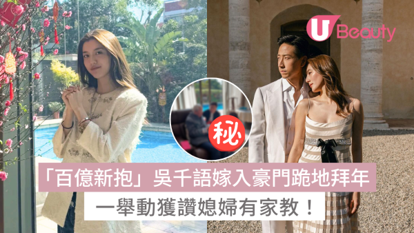 新年佳節不少人都外出拜年,而「百億新抱」吳千語亦有與老公到男方家中拜年。日前施伯雄更在社交平台貼出與老婆吳千語拜年的相片,相中見吳千語身穿白色上衣與牛仔褲跪在地上,與施伯雄爺爺施子清聊天拜年,避免老人家需要抬頭說話的情況,十足廿四孝新抱,而施伯雄則在爺爺身旁,準備接利是。