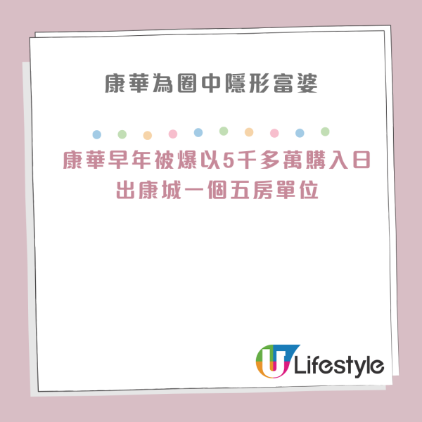 康華除了保養得宜外,還懂得投資,一向節儉的她,喜歡儲錢買樓,並視睇樓為娛樂。作為圈中的隱形富婆,她手持多個物業⋯