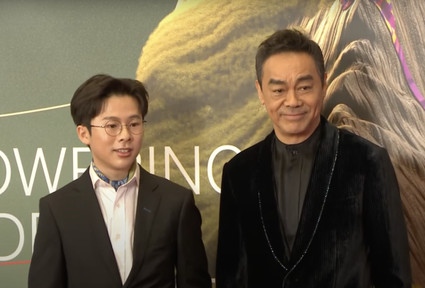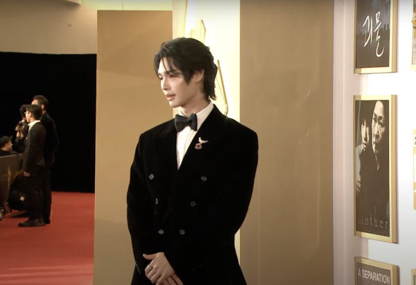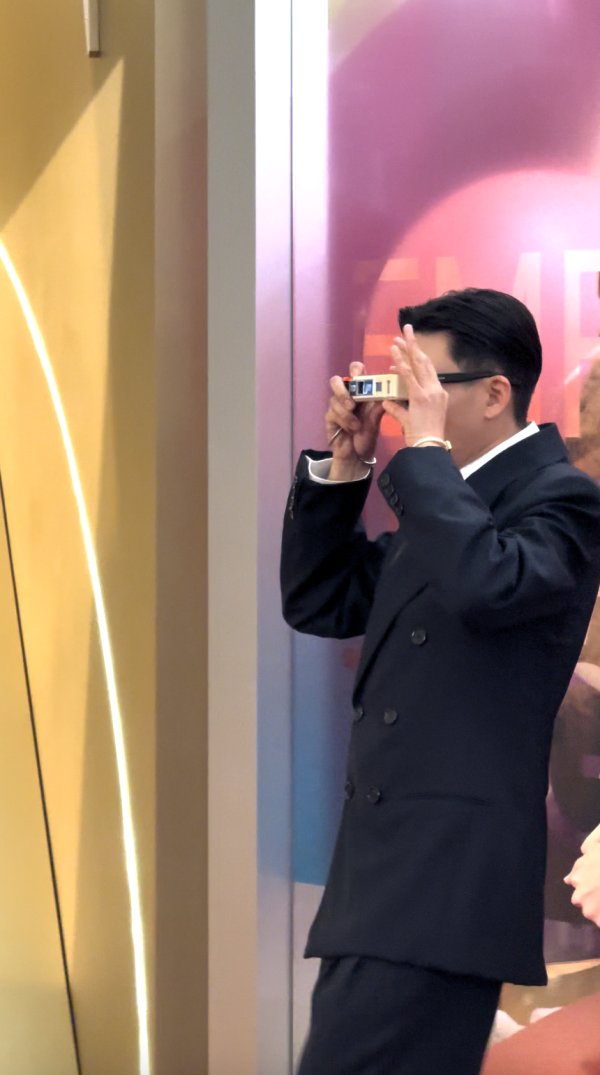 青年大使盧鎮業以一身 Saint Laurent 西裝搭配粗框黑色眼鏡,並配戴 Tiffany & Co. 珠寶踏入紅地毯,他更拿出菲林相機登場,趣味十足!