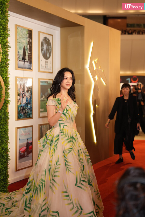 湯唯以綠色露肩公主裙登場,加上一頭曲髮,再配戴Chopard的珠寶,具備優雅韻味,氣質十足!