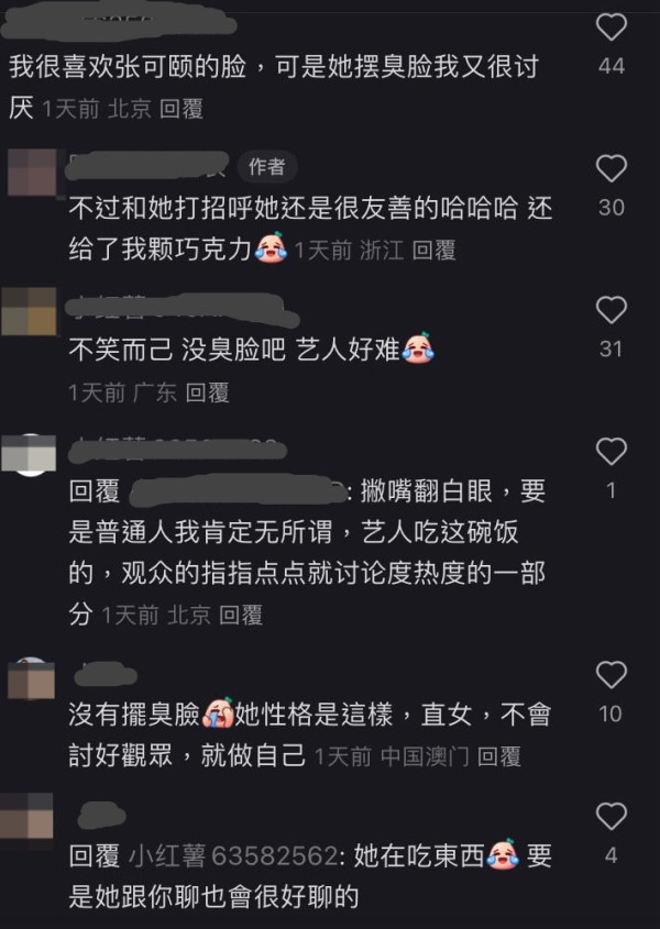 隨後有粉絲留言還原真相,指與張可頤打招乎還是很友善,還給了粉絲一粒巧克力。亦有網民指影片中的張可頤只是正常的走路狀態,不過有網民其後都發佈了數張張可頤在電影院內宣傳的相片,可見到她笑容滿臉地與粉絲互動,十分親切。所以相信張可頤只是急時間走得快一點,並沒有黑面。另亦有網民分享了張可頤的生圖,全新的金髮形象被指判若兩人,臉上更略見憔悴老態。