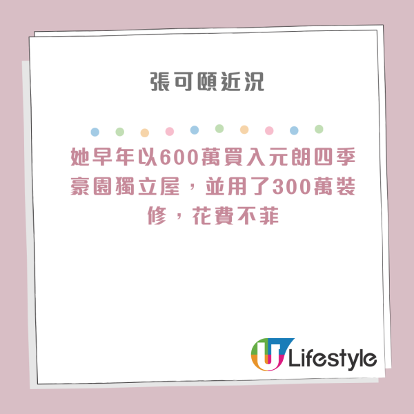 現年55歲的張可頤拍下多部經典劇集包括《難兄難弟》、《金枝慾孽》、《九五至尊》等而人氣高企,更有「港視一姐」之稱。張可頤2020年拍完劇集《暖男爸爸》後,就未有接拍港劇,反而轉戰內地,開設經理人公司。張可頤趁著空閑時間多與朋友相聚,最近她於社交平台分享的照片就意外曝光現正居住的豪宅!