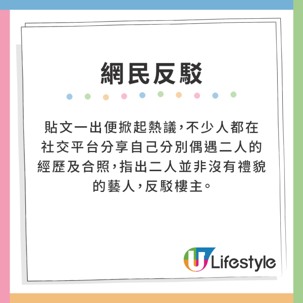 貼文一出便掀起熱議,不少人都在社交平台分享自己分別偶遇二人的經歷及合照,指出二人並非沒有禮貌的藝人,反駁po主。