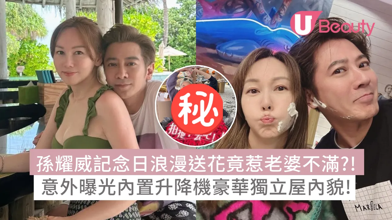 近日孫耀威在社交平台上分享題為「拍拖記念日第N個週年!」的短片,片中孫耀威叫醒老婆陳美詩後,一同乘坐升降機到客廳,陳美詩就看到客廳上擺放着巨型心形玫瑰花束後,「嘩」了一聲並冧爆甜笑,看來非常滿意這份驚喜!孫耀威更指紅色玫瑰完勝一大堆人民幣,不過陳美詩似乎就有微言,寫著「一個沒梳頭髮,一個沒有畫眉毛,真的很驚喜!」孫耀威就回覆老婆「驚喜就是要出其不意!」兩人大耍花槍,更顯恩愛!
