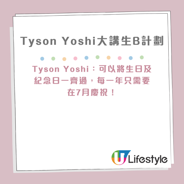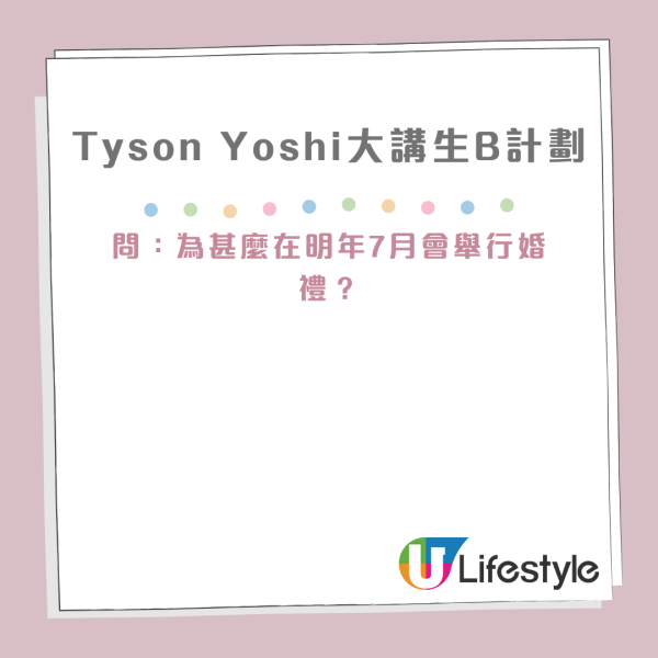 Tyson Yoshi早前曾透露明年7月會舉行婚禮,被問到為何在7月舉辦,他就話可將生日及紀念日一齊過,每一年只需要在7月慶祝!一向喜歡小朋友的Tyson Yoshi就表示已有生B計劃,想生一仔一女,湊一個好字,不過他就表示有難度,但仍希望「一舖搞掂」。