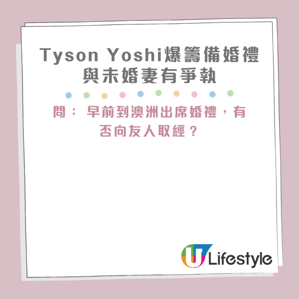 Tyson Yoshi 早前到澳洲出席友人婚禮取經,他出席活動接受訪問時提及,有預感會與未婚妻因婚禮細節而有爭執,更表示要將婚禮籌備得更加妥善。向來不擅長說肉麻話的Tyson Yoshi 就表示最近因結婚誓詞而頭痛,亦因提議取消誓詞環節,卻被未婚妻否決。
