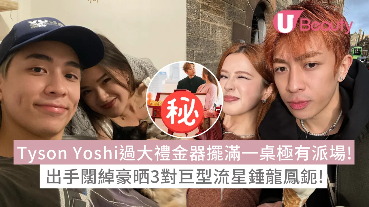 家底豐厚的Tyson Yoshi在整個「過大禮」儀式出手闊綽,照片所見,兩人站在落地玻璃窗前,桌面擺滿了各式各樣的金器,包括金光閃閃的龍鳳鈪、流星錘金鐲、金鏈、金頸鏈及多款精緻金器,陣容豪華。