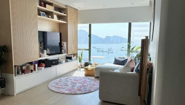 相中可見,麥明詩與盛勁為的愛巢樓底極高,空間十足,即使在客廳放置了巨型沙發,依然寬敞。裝潢就以原木色為主,整體設計簡單又溫馨,而最吸睛一定是落地玻璃外的維港景色。