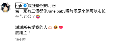 吳雨霏亦貼出與大仔和細女慶生的相片,並感謝Brian表示:「瘋狂慶祝的月份,當一家有3個都係June baby嘅時候原來係可以咁忙,辛苦老公了,謝謝所有愛我的人,感謝主!」原來6月除了是Kary生日外,亦是一對子女的生日。不少圈中好友及粉絲都紛紛祝Kary生日快樂,並表示被兩公婆「閃盲了」