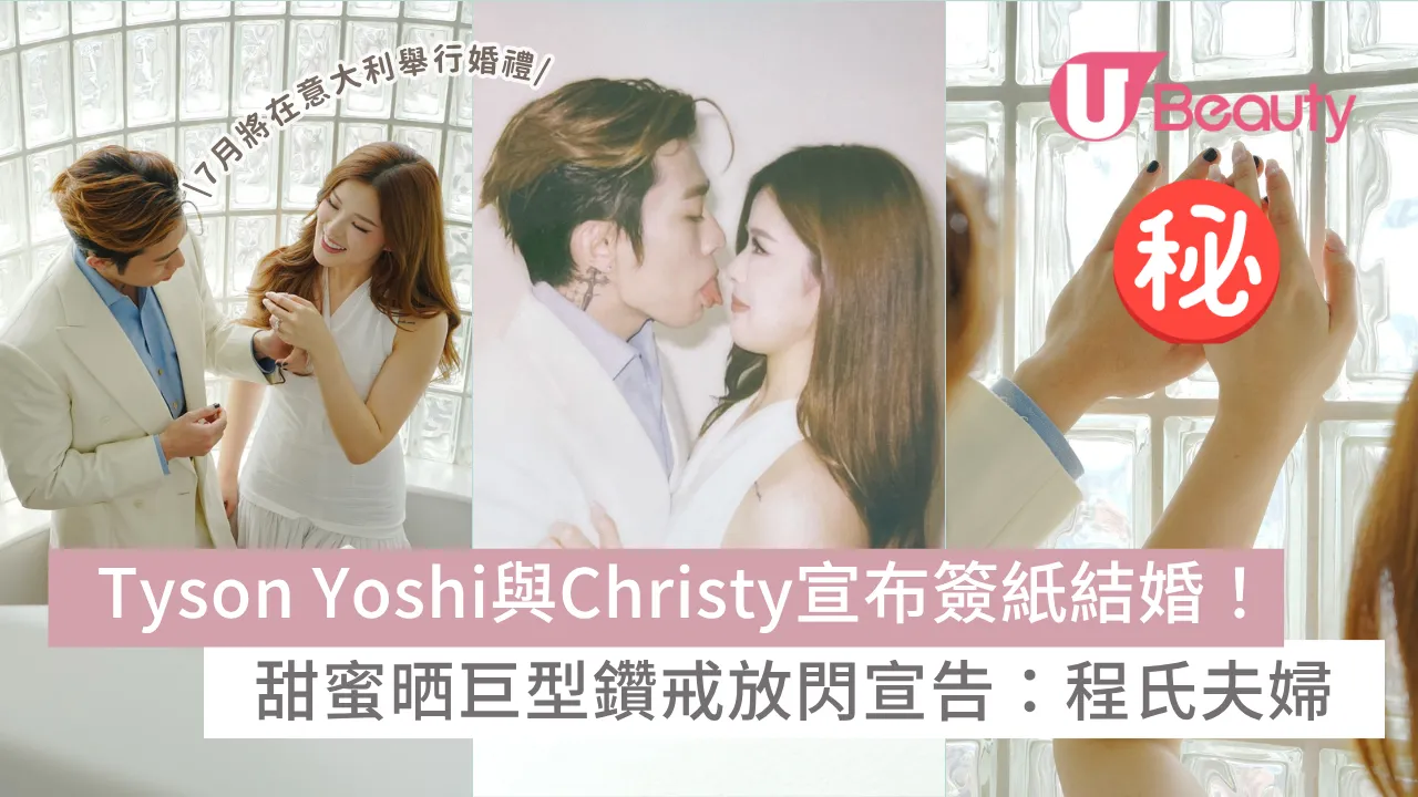 恭喜Tyson Yoshi!現年30歲的唱作歌手Tyson Yoshi(程浚彥)絕對是近年事業愛情兩得意的代表!與圈外女友Christy穩定交往7年,去年在加拿大驚喜求婚成功,讓大批粉絲一同見證這份甜蜜。正當大家期待二人將於今年7月在意大利舉行的童話式婚禮時,Tyson今日(19日)無預警在IG投下「閃光彈」,宣佈已經與Christy正式簽紙註冊,成為「程太太」!在公開的甜蜜合照中,除了兩人滿瀉的幸福感,Christy手上那枚閃爆的巨型鑽戒更是瞬間成為全城焦點,實在太令人羨慕了!