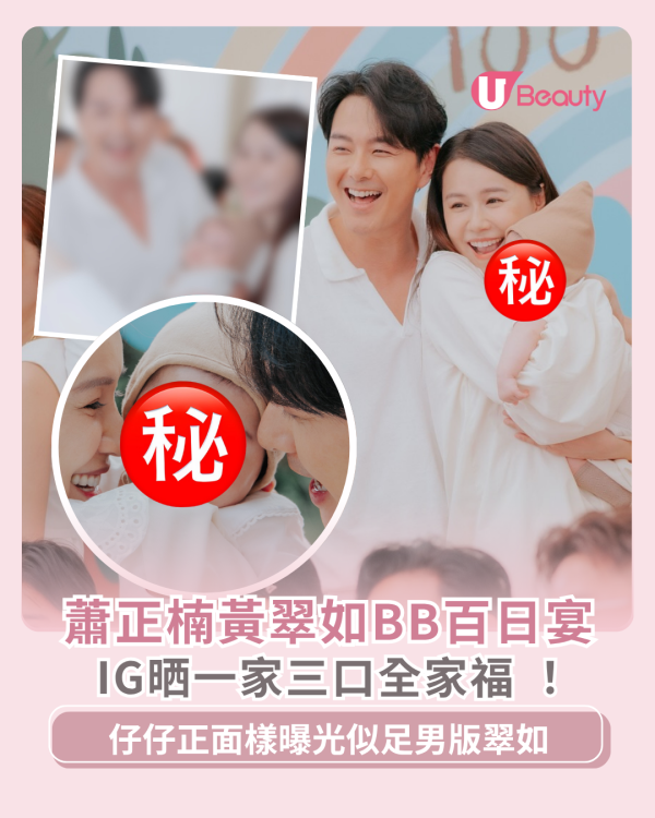 黃翠如與蕭正楠於2018年結婚,早前終於迎來家庭新成員,誕下囝囝「笑哈哈」,榮升新手爸爸媽媽,組成一家三口,溫馨幸福滿瀉。不過翠如就一直未有公開BB「笑哈哈」的真面目,而日前「笑哈哈」百日宴,二人終於晒出仔仔的正面樣,一家三口全家福引起網民熱討!