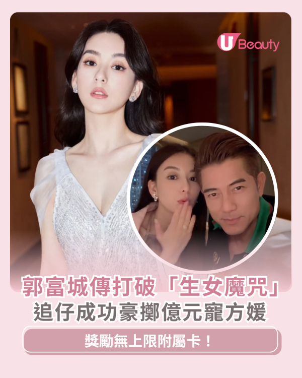 52歲的天王郭富城與30歲的太太方媛結婚八年來,已育有兩名女兒,家庭生活一直幸福美滿。早前兩人公佈懷第三胎喜訊,雖然懷孕數月的方媛一直未透露胎兒性別,但近日有報導盛傳方媛已追仔成功,更有傳郭富城將打破四大天王「生女魔咒」,終於擺脫「外父命」,豪擲億元之外又為太太方媛送無上限的附屬卡,引起網民熱議!