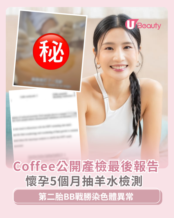 Coffee近日拍片透露在進行一項名為Panorama的美國基因檢測後,顯示一切「低風險」,寶寶患有T13的機率「低於萬分之一」,不過由於早前的T21報告異常,令她仍然擔心。於是在主診醫生建議後,她決定再做一次T21染色體篩查報告,不過今次的報告竟然顯示腹中寶寶的T13(巴陶氏症候群)染色體指數,有輕微上升,令Coffee決定「抽羊水」檢測。