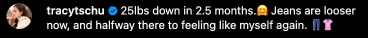 在5月中「升呢」成為媽咪的港姐朱千雪(Tracy),在囝囝出世時在社交平台分享BB腳仔的照片並開心配文:「Ours 」宣布喜訊!產後至今Tracy在社交平台上分享大多數都是自拍照,早前終於po出產後全身照以及行山美照,大晒減肥成果!Tracy在社交平台上分享兩張在家中露台拍的照片,並留言表示指在2個月期間減走25磅,就連牛仔褲都變得寬鬆,感覺自己又找回一半的狀態!見到Tracy的牛仔褲還有一個手位,力證修身成功,榮升做媽咪的她依舊皮膚白滑,與未生B前完全無分別!