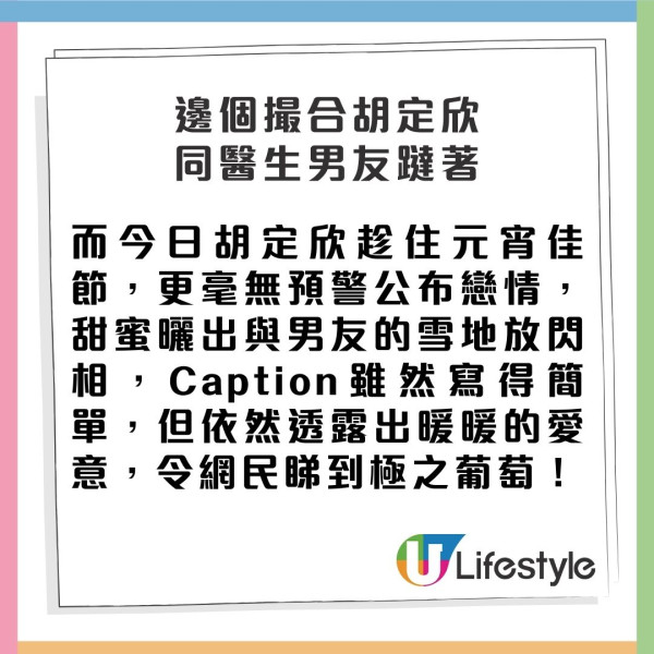 胡定欣最近人靚心情正,跟圈中好友到了日本二世古滑雪,而今日元宵佳節,胡定欣毫無預警公布戀情,曬出與男友的雪地放閃相,令甜蜜到漏的戀情曝光…