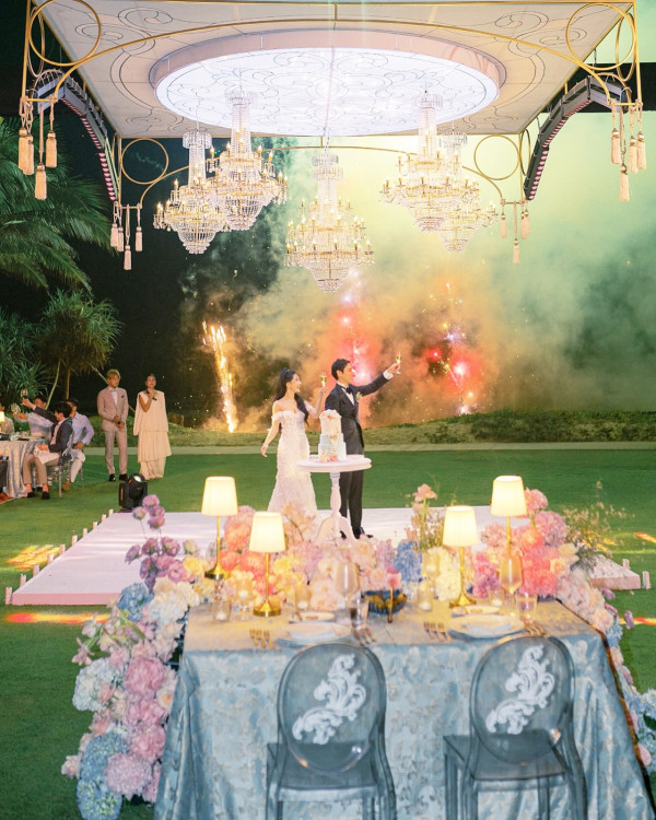 早前「40億千金」蔡頌思與日籍金融才俊老公Mikie在香港舉行婚禮,當晚Jocelyn足足換了7條裙,金器更是掛滿全身!而日前二人再到越南舉行海外婚禮,排場竟然比香港場更豪華!海外婚禮的場地選在二人訂婚後慶祝的星級度假村舉行,主要邀請好友出席,鮮花放滿全檯,戶外場地更不停放煙花,氣氛極度浪漫!