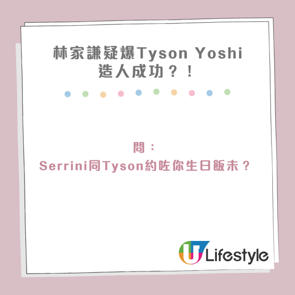 林家謙昨晚在紅館演唱會完騷後被問到有沒有與圈中兩位好友Serrini及Tyson約食生日飯時,他的回應疑爆出Tyson Yoshi造人成功?!