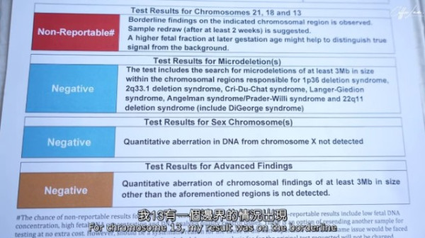Coffee在影片中解釋,最初進行的T21產前篩檢報告未能就T13風險得出明確結果,形容其為「灰色地帶」。為求安心,她兩星期後再進行另一項名為Nifty的同類檢查,豈料結果依然一樣,這讓她的負面情緒達到極點,直言「我是晴天霹靂,我真的覺得我真的有事」。醫生解釋,這兩項篩查技術或未能清晰分辨母體、過往流產胚胎殘留,以及現時胎兒的DNA,導致結果剛好落在「不上不下」的臨界點。焦急的Coffee更親自致電化驗所查詢,獲悉其DNA指數「剛剛好是3」,而3正是判斷為陽性或陰性的分界線,因此化驗所無法發出正面或負面的報告。