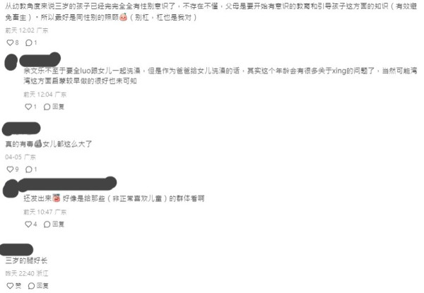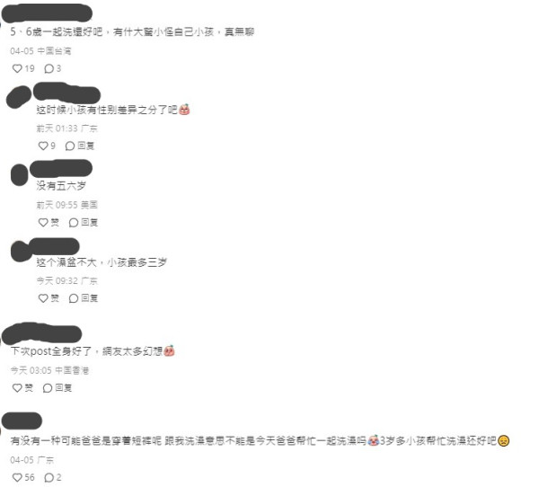 不過亦有網民認為「他(余文樂)明明是坐在盆外面啊!肯定穿裤子了」、「5、6歲一起洗還好吧,有什麼大驚小怪,自己小孩,真無聊!」、「3歲多小孩帮忙洗澡還好吧」、「其實陪女兒洗澡就是陪着她玩水,大家都不知道想哪里去,這個盆子我家裏同款,只能坐下寶寶」。