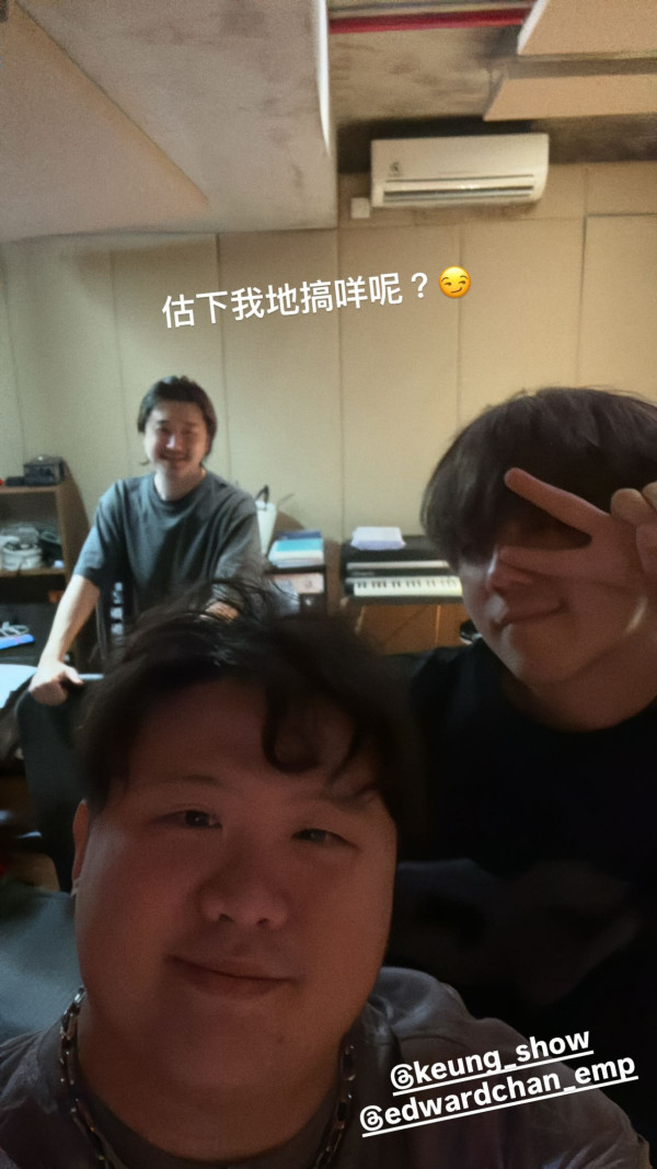 最近ERROR成員肥仔(梁業),在IG限時動態上分享與音樂人Edward Chan(陳浩然)及姜濤的在錄音室中的合照,並寫著「估下我地搞咩呢?」,3人過往曾合作歌曲《特務肥姜2.0》,未知是否將再度推出新歌呢?