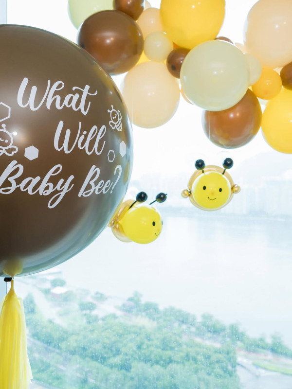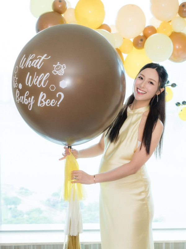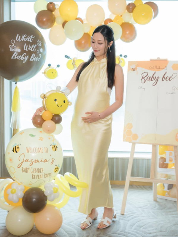 Jasmine在社交平台分享多張舉辦揭曉BB性別派對的相片,相中可見, Jasmine穿着淺黃色長裙,造型高貴又大方,即使已懷孕八個多月,手腳依然纖瘦,肥胎不肥人,狀態極好!Jasmine又貼出與老公的甜蜜合照,恩愛的畫面讓人非常羨慕!Jasmine更為派對精心準備了甜點、大量黃色及蜜蜂造型氣球,雖然她未有向外界公開BB的性別,但有網民就猜測她是陀仔!