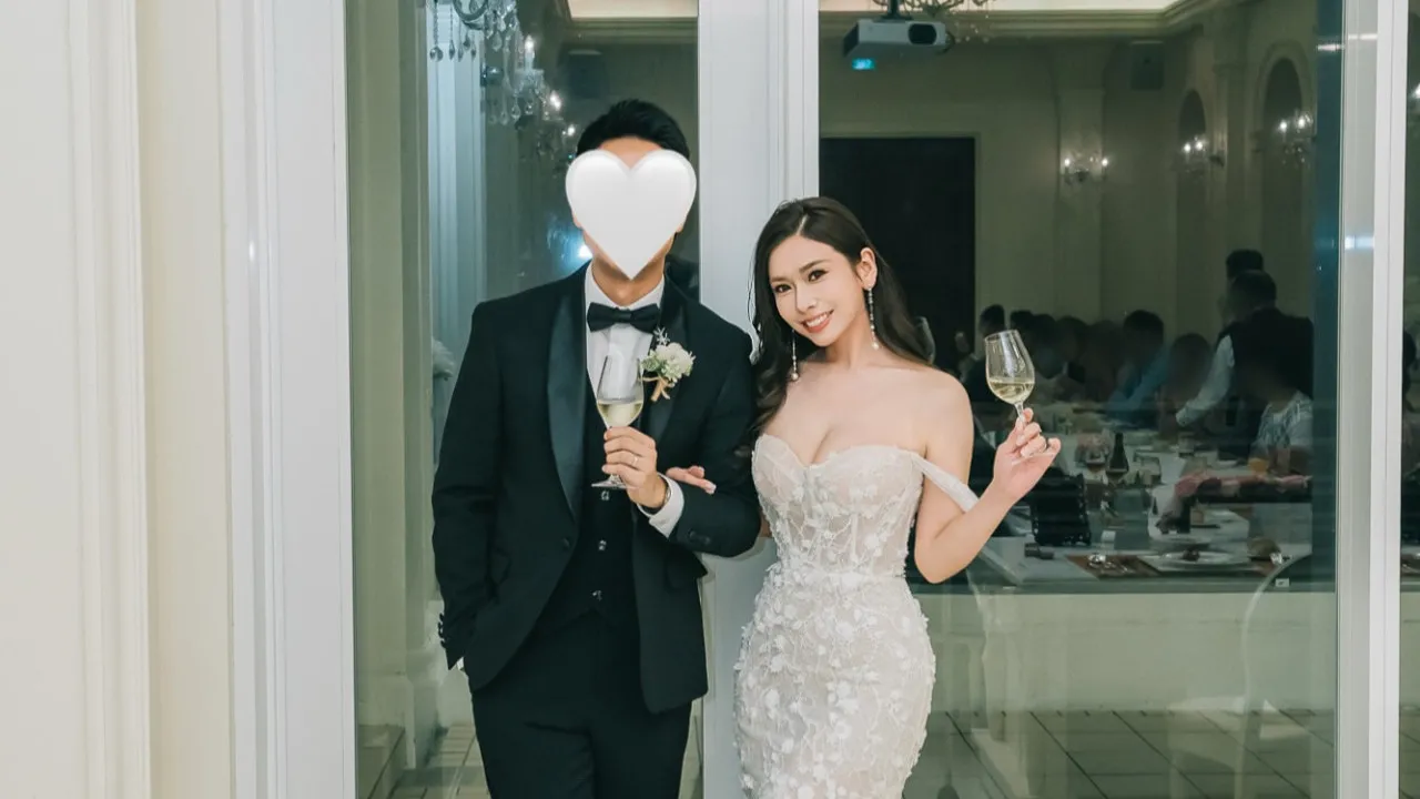 另外梁凱寧親友宴會及after party的相片,在宴會上Maggie換上白色花花魚尾禮服,緊身設計將她的姣好身材完美展現,舉杯大方接受親友們的祝福。而after party則選擇在沙灘上舉行,Maggie以短版紗裙現身,外面披著老公的西裝外套,雖然老公的面容被白色心心Emoji遮蓋,但仍感受到滿溢的幸福氛圍。