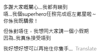 女朋友亦發文表示「多謝大家嘅關心…我都有睇到!唔…我個superhero任務完成返左氪星啦~你係我既驕傲!但係對唔住,我想同大家請一個小假期,因為..我真係接受唔到,我好想好想可以再拖住你隻手…」
