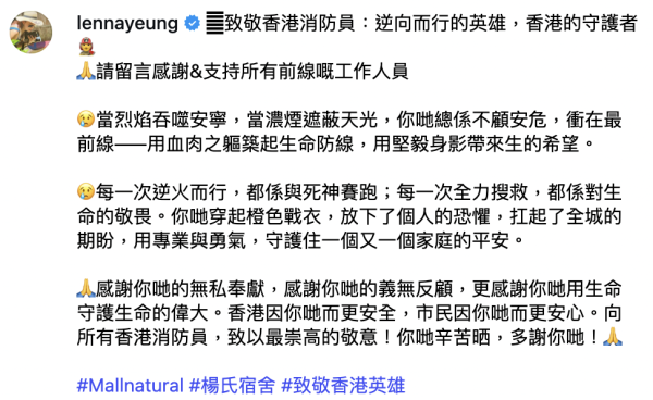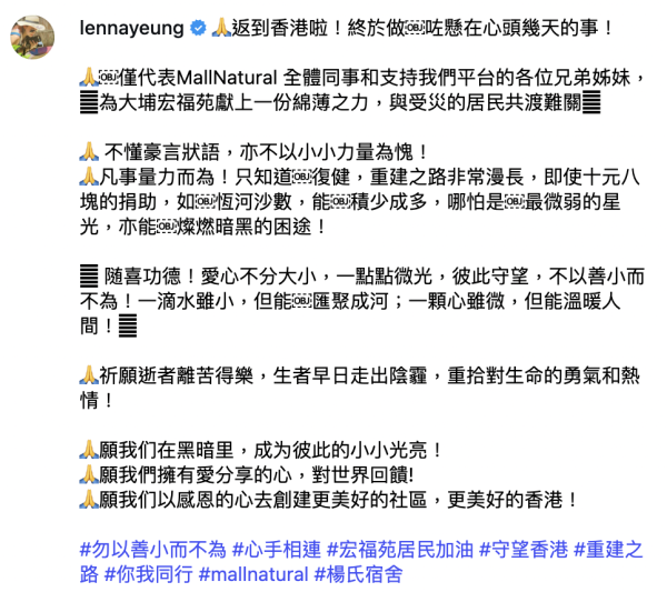 日前,楊卓娜透過社交平台向粉絲交代自己趕回港,完成了懸在心頭幾天的事。她代表網購平台 MallNatural 的全體同事,捐出港幣五萬元,為大埔宏福苑的受災居民獻上一份綿薄之力。這份及時且真誠的援助,為災民帶來幫助與溫暖。