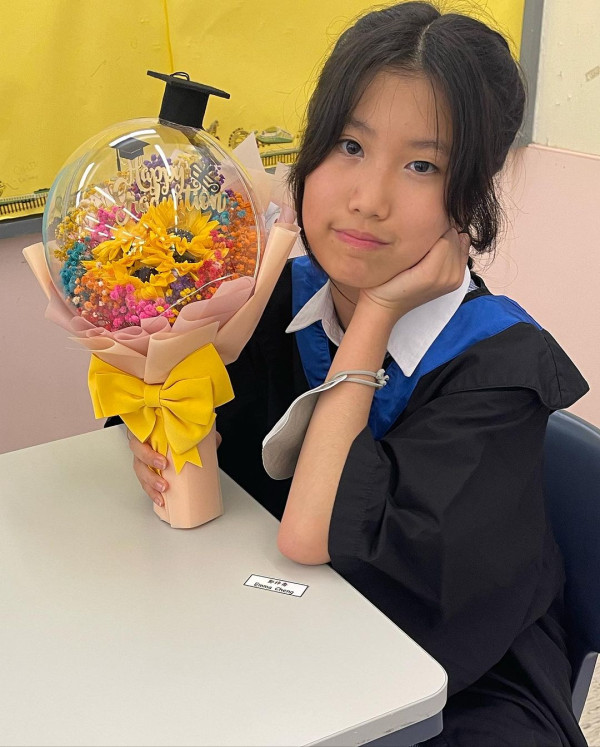 相片可見,現年13歲的Emma已經搖身一變,成為一位亭亭玉立的少女。身穿畢業袍的Emma留着與媽媽一樣的中分長髮,並手持畢業花束,面露微笑與爸媽面貼面合照。退去稚氣的Emma不僅擁有一張標誌的鵝蛋臉,而且更暴風式抽高,身高一度追平媽媽余思敏。