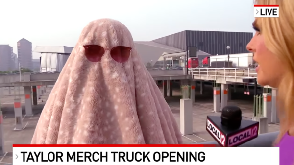 這名Swiftie(Taylor Swift粉絲稱號)以粉紅色毛毯完全遮蓋上半身,只露出一副太陽眼鏡,在俄亥俄州辛辛那提排隊購買演唱會紀念品,卻突然被美國CBS電視台發現身上有趣裝束,隨即馬上展開訪問。在接受記者訪問時,這位歌迷表示自己特別詐病請假參加演唱會,從肯塔基州開車到現場排隊等候購買演唱會相關紀念品。她透露,這次排隊最主要的目標是購買Taylor Swift演唱會的衛衣。