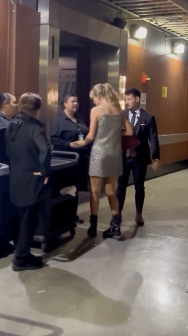日前網上流傳Taylor Swift進入格林美獎會場時的片段,,片中Taylor Swift身穿銀色閃片短裙,正在步行入會場時,忽然回頭走向工作人員面前,並逐一給予小費及答謝,超貼心的舉動讓不少粉絲大讚Taylor Swift人美心善!Taylor Swift作為國際巨星,仍不忘感謝一眾工作人員,善良又慷慨的舉動,難怪不少人都被Taylor Swift所迷到了!