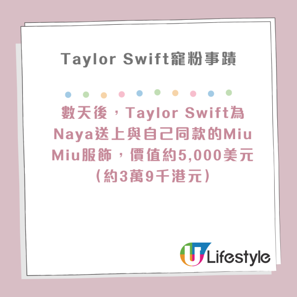 一向寵粉的Taylor Swift,不時為粉絲送上驚喜,除了手寫信及捐款幫助完成粉絲的夢想外,亦曾Miu Miu服飾與樓給粉絲!Taylor Swift亦非常關心一眾幕後工作人員,為答謝全體巡演工作人員的艱辛付出,發放近2億美金獎金(約15.3億港元),早於2023年的北美巡演,Taylor Swift已豪派5500萬美元獎金,連開貨車運送器材的司機都不例外獲得獎金,相當貼心!