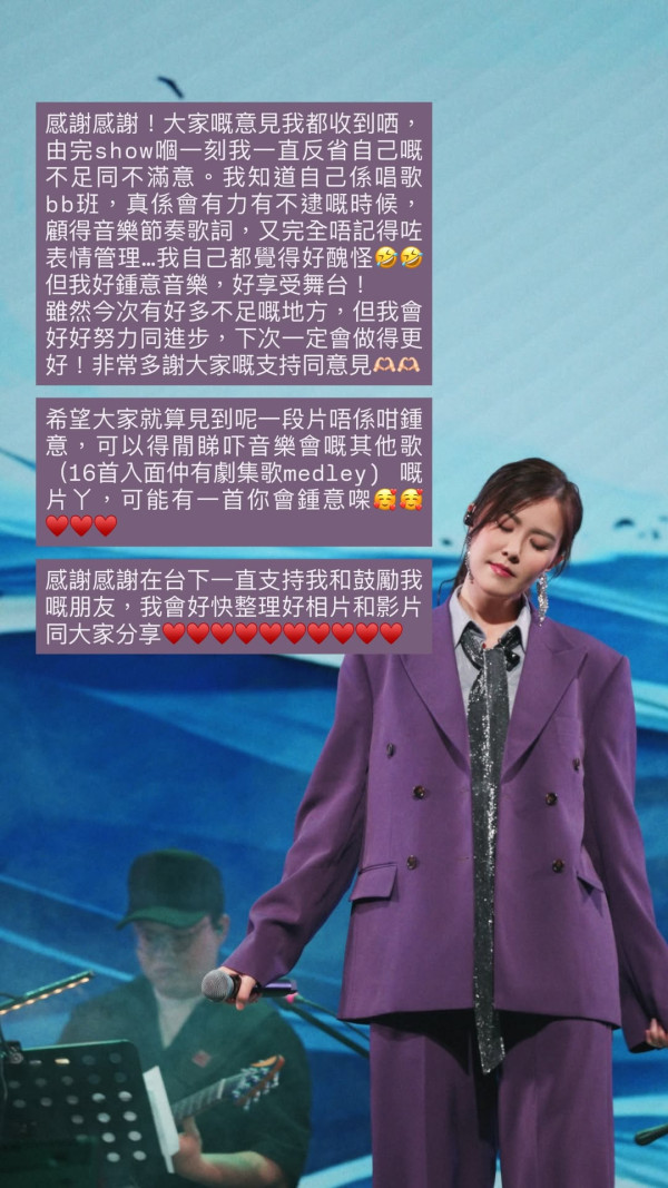 對於外界的評價,劉佩玥就在社交平台上回應,表示自己是「唱歌bb班」,一直在反省不足,並指當時只顧著音樂節奏及歌詞,所以未有好好管理表情,她又承諾會繼續努力及進步,未來表現更好。