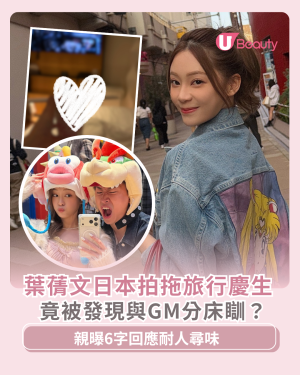 難得「圓夢」葉蒨文在社交平台上分享旅行相片,大放閃光彈,Sophie先是貼出二人一同到主題公園遊玩的相片,她身穿白色毛毛外套及粉紅色連身裙,而GM就身穿藍色牛仔褸及灰色褲子。戴上公仔頭套的他們,一起擺出趣怪表情,又抱著公仔對鏡自拍,即使沒有親密行為,亦不難看出二人好感情。