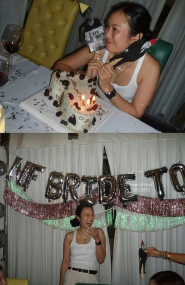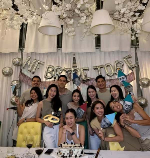 Namfon的好友們為她舉辦了一場婚前派對,從前TVB小花伍樂怡(Kelly)分享的照片可見,派對現場佈置溫馨浪漫,掛上了「NF BRIDE TO BE」的字樣氣球,NF顯然是Namfon名字的縮寫。派對上,姊妹們不僅準備了精緻的蛋糕,更別出心裁地製作了多個印有準新郎霍啟仁搞怪表情的人形紙牌,讓Namfon在拍照時能與「未婚夫」隔空同框。