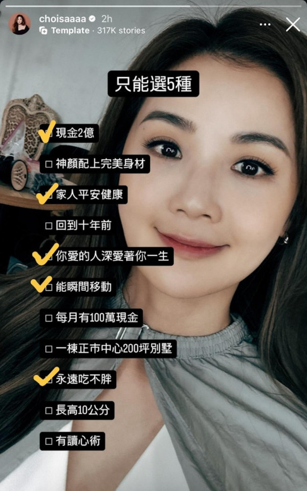 阿Sa曾經與鄭中基有過一段婚姻,離婚後與陳偉霆的姊弟戀亦曾轟動一時,前年再與「百億富三代」石恆聰分手,可以說是情路坎坷。雖然經歷多段未能開花結果的感情,但阿Sa依然對愛情保持樂觀心態,早前她在社交平台限時動態上發文,玩近期流行5種願望,似乎就透露自己對愛情的看法!