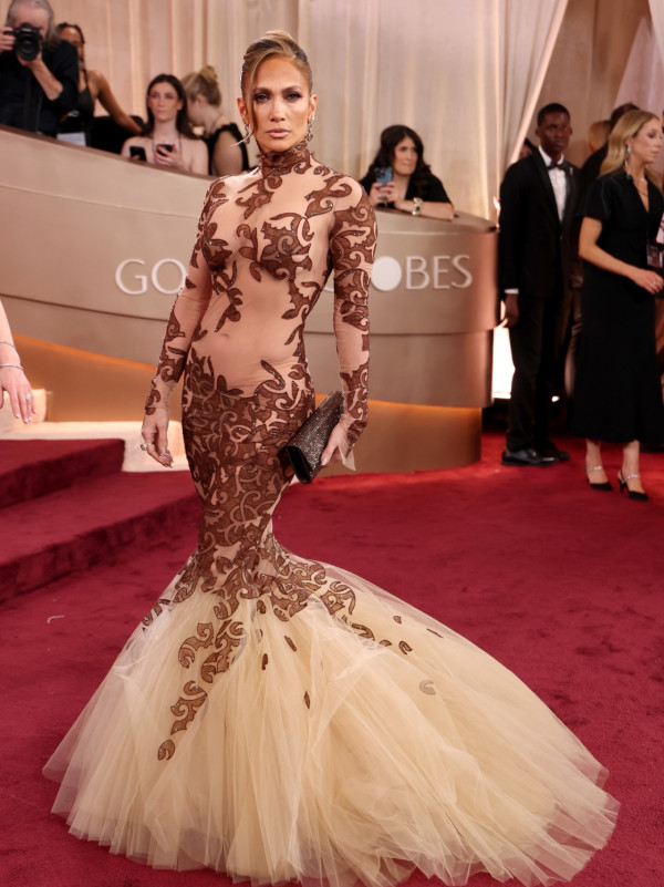 金球影后Jennifer Lawrence今次的戰衣尺度驚人。她身穿Givenchy全透明的肉色繡花長裙,當她褪下香檳色外套後,全身僅靠重點部位的花卉刺繡遮掩,其餘部分全是肉色透視,視覺效果宛如「夏娃」般性感,震撼全場。