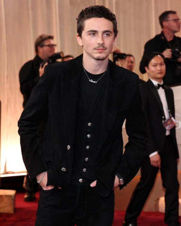 後來在頒獎台上則換上Thom Browne 2026春夏系列的銀色鏡面裝甲式禮服與同為Bvlgari品牌大使的Priyanka Chopra一起頒獎。