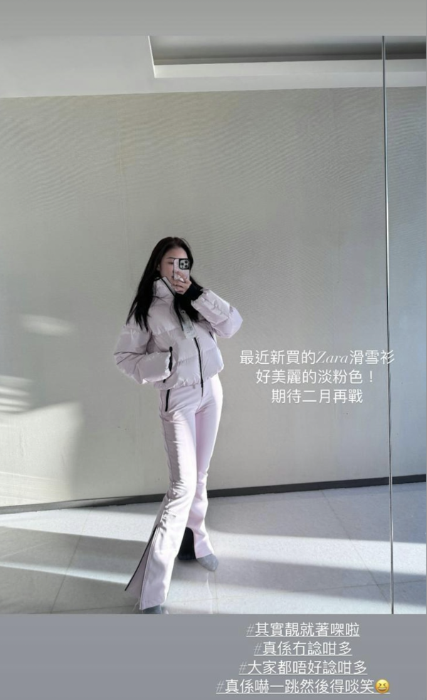何依婷近年多次因奢華行頭、住豪宅與名牌裝扮而被標籤為「炫富」,雖然她曾公開澄清不拜金,但依然引起無數網民熱議。對於早前穿著5位數滑雪裝一事,何依婷似乎不想外界將重點放在她的名牌打扮上,她在社交平台限時動態中貼出自拍照,並強調「最近新買的Zara滑雪衫」,又標籤「其實靚就著㗎啦」、「真係無諗咁多」、「大家唔好諗咁多」。翻找Zara官網,發現這粉色滑雪套裝價錢不足3千港元,是次舉動隨即惹來揣測,認為她想透過穿著平價衣物向外界澄明自己並非只愛名牌!