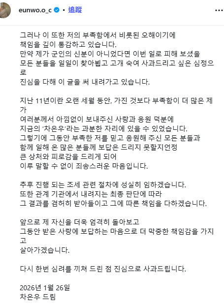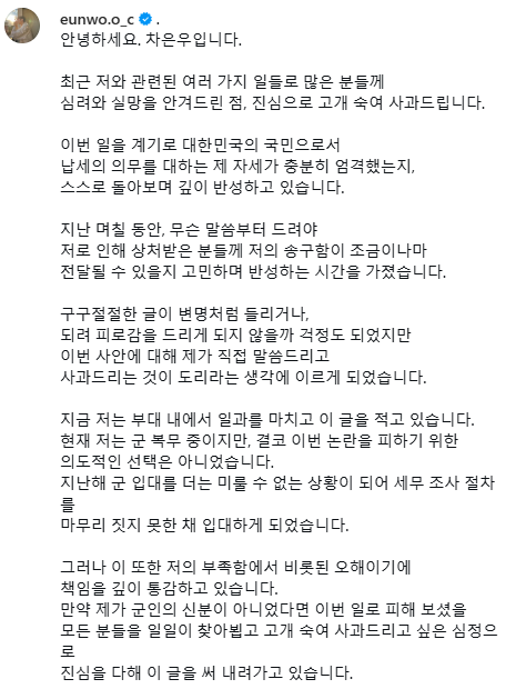除了針對入伍時機作出澄清外,車銀優在信中更以大篇幅向粉絲及大眾致歉。他感性回顧出道 11 年的心路歷程,直言自己擁有的才華遠不及不足之處,全因大眾毫不保留的愛,才讓他能站在「車銀優」這個榮耀的位置。他自責地表示,本來應該回報這份厚愛,卻因稅務爭議帶給身邊人「巨大的傷害與疲憊」,對此感到難以言喻的抱歉。