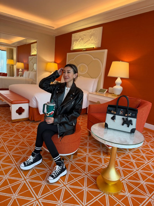最近是區文詩的43歲生日,她在社交平台分享一輯到澳門遊玩的美照,相中她到訪新濠天地的空中餐廳,又在酒店內做spa及品嚐精緻佳餚,將慶生之旅提升至貴婦級的享受!相中另一個搶眼之處,就是她手上的愛馬仕手袋,據指袋型為 Black Swift Leather and Toile Birkin 25,翻查網上購物平台,售價逾20萬港元,而袋上更掛有愛馬仕價值7千港元的黑色馬仔吊飾,貴氣逼人!