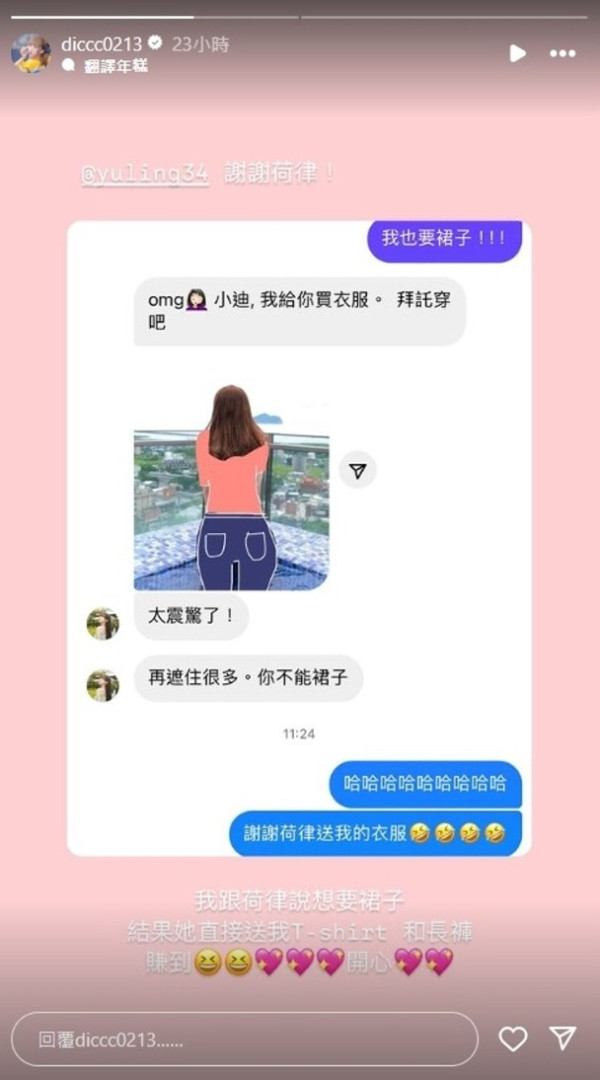 冼迪琦超大尺度的水著照除了驚艷一眾網民外,更嚇怕隊友邊荷律,並提點冼迪琦要多穿點衣服!隊友邊荷律表示:「omg小迪,我給你買衣服。拜託穿吧」,然後搞笑地為冼迪琦的泳裝照畫上衣服,她又話:「太震驚了!再遮住很多。你不能裙子」,曲線地讚賞冼迪琦的美好身段!