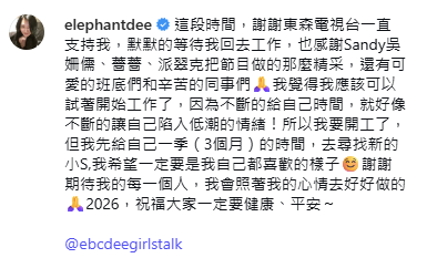 「這段時間,謝謝東森電視台一直支持我,默默的等待我回去工作,也感謝Sandy吳姍儒、薔薔、派翠克把節目做的那麼精采,還有可愛的班底們和辛苦的同事們🙏我覺得我應該可以試著開始工作了,因為不斷的給自己時間,就好像不斷的讓自己陷入低潮的情緒!所以我要開工了,但我先給自己一季(3個月)的時間,去尋找新的小S,我希望一定要是我自己都喜歡的樣子☺️謝謝期待我的每一個人,我會照著我的心情去好好做的🙏2026,祝福大家一定要健康、平安~」